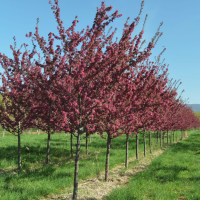 Небольшое, декоративное дерево с пышной, развесистой формой кроны высотой 4-6 м с бордовыми листьями, и розово-красными цветками.