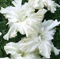 Невозможно представить цветник без этого элегантного господина, взирающего на мир с чувством аристократического достоинства. Гладиолус Сноуи Раффл представляет собой симбиоз устремленного ввысь стебля, мечевидных изящных листьев и собранных у основания цветков белого цвета с ажурными нежными краями.