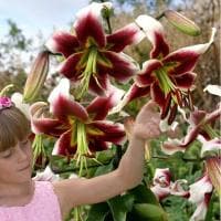 Каталог лилий рад представить вниманию садоводов эксклюзивную, обворожительную и в какой-то мере экзотическую красавицу из группы ОТ-гибриды – лилию Лесли Вудриф. На стройном полутораметровом стебле в августе распускается около десятка гигантских соцветий-звезд по 25 см в обхвате. Издалека цветы подобны на огромные спелые вишни, окаймленные ярко-белой лентой по краям. В центре бутона – большое зеленое горло, украшенное ярко-желтой каймой.